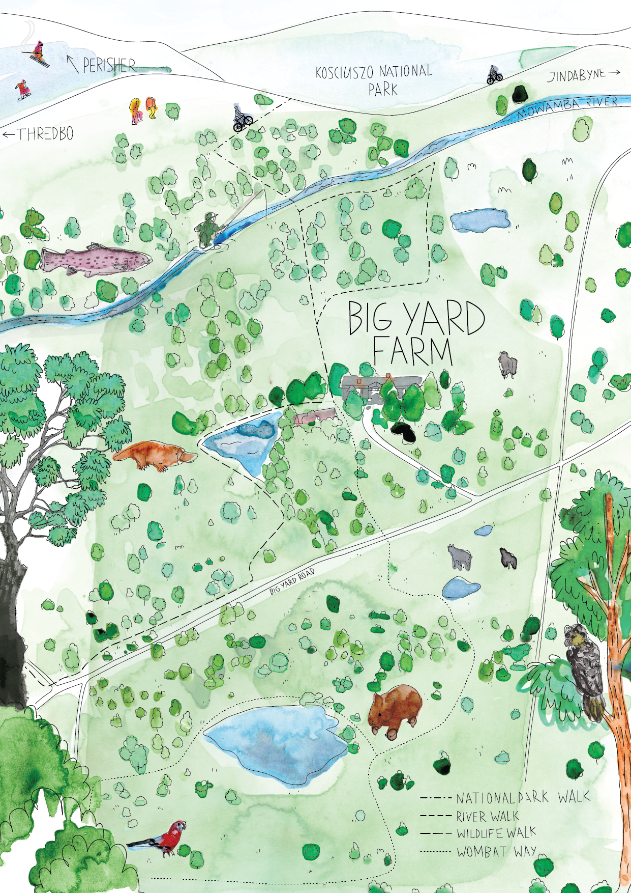 Big Yard Farm is around 35 minutes’ drive from the snowfields at Perisher, Smiggins and Thredbo, a little further to Charlottes Pass and under 15 minutes’ drive to Jindabyne for supplies and gear.